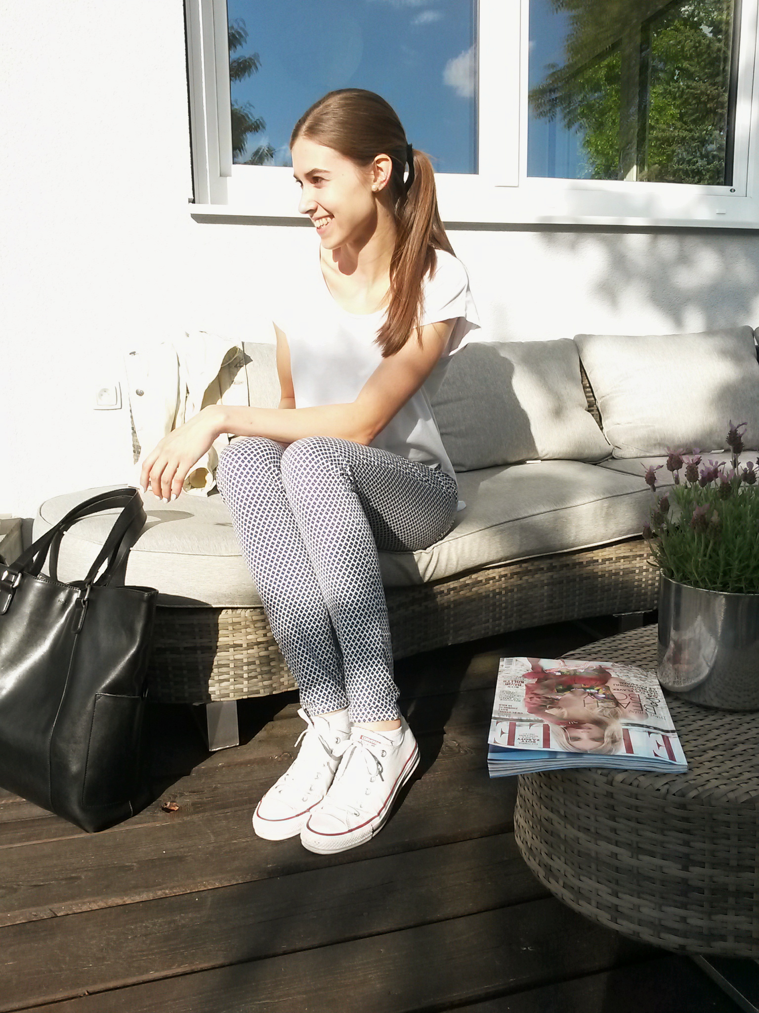 A teď k mému outfitu. Takhle mě moc často nepotkáte…tím mám na mysli ty podpatky, jestli se tomu tak dá říkat 😀 Abych se přiznala málo kdy si je vezmu. Možná proto jsem si v nich občas nejistá, ale říkám si, že každá žena by měla umět chodit na podpatcích. Proto i já to zkouším, ale není nad to, vyměnit je za tenisky nebo balerínky 😀 Ovšem když jsem tyhle boty viděla, byla to láska na první pohled. A věřte nebo ne, dá se říct, že jsou pohodlné. Bílo modré pruhované triko jsem si koupila před týdnem v Zaře. Je tak příjemný, ideální na horký letní dny (pokud se nějakých letos dočkáme :D). Černé slim džíny by měla mít každá holka. Hlavně malá rada…vypadají lépe než průhledné legíny:)